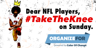 #TakeTheKneeWe understand that this is a conversation about Power, and recognize that our Constitutional rights of free speech should not be granted to some and strategically limited for others. Twice in as many weeks, Donald Trump has come for the livelihood of Black athletes and journalists who continue to speak out against injustice at great risk to their safety, employment and their ability to pursue passions to which they’ve dedicated their lives. First, he called for the firing of Jemele Hill for tweeting her opinion on her social media platform. This week, at a rally in Alabama, Trump used coded language calling for NFL owners to “fire” athletes who are expressing their freedom of speech, to speak out in protest of police brutality and systemic racism and inequality. Athletes like Michael Bennett, Eric Reid, Colin Kaepernick and so many others. Perhaps he was feeling emboldened by NFL buddies like Dan Snyder (Washington), Shad Khan (Jaguars), Bob McNair (Texans), Robert Kraft (Patriots), Woody Johnson (Jets) and Stan Kroenke (Rams), all of whom each contributed $1 Million to his inauguration. He's also seen the league's owners refuse to sign Colin Kaepernick and has even taken credit in the past for getting him blackballed. This time Trump felt emboldened enough to call for NFL owners to instruct personnel that if players do not stand for the flag they should “get that son of a b---- off the field right now…” This is yet again another example of Trump’s long history of intimidating and silencing dissent. Trump has continued to suggest that "great American values" are limited to those who go along with business as usual, and don't speak out against systemic racism and oppression. Everyone in the NFL, especially NFL Leadership, must understand that the 'respect for players' stated in their press release after Trump's disturbing remarks should also mean respecting the rights of players to exercise their freedom of speech however they choose. It is time the league acts by supporting their players right to speak out. We’re in a pivotal moment when everyday Americans and athletes with shared values of justice and equity are using their powerful voices to say enough is enough--no more racism, no more anti-Muslim bigotry, no more misogyny, and no more Trump! We must continue to support the athletes and everyday men and women that are risking their livelihoods to kneel for justice. Dissent in part of America's culture and history. To quote the late author James Baldwin, 'I love America more than any country in the world and, exactly for that reason, I Insist on the right to criticize her perpetually.'42,360 of 45,000 SignaturesCreated by Ken Miles