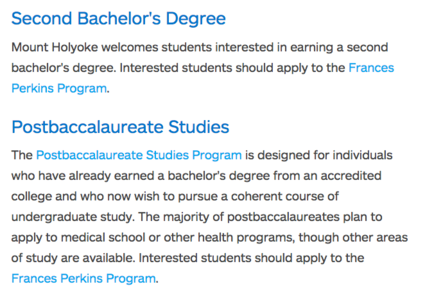 The reason she gave was that I already have a bachelor's degree, despite Mount Holyoke's website welcoming applicants with bachelor's degrees to apply to the Frances Perkins Scholars program, a program fully funded at a White House summit in 2014. After my disheartening phone call, Mount Holyoke’s administration changed the website to accommodate its discriminatory practices.